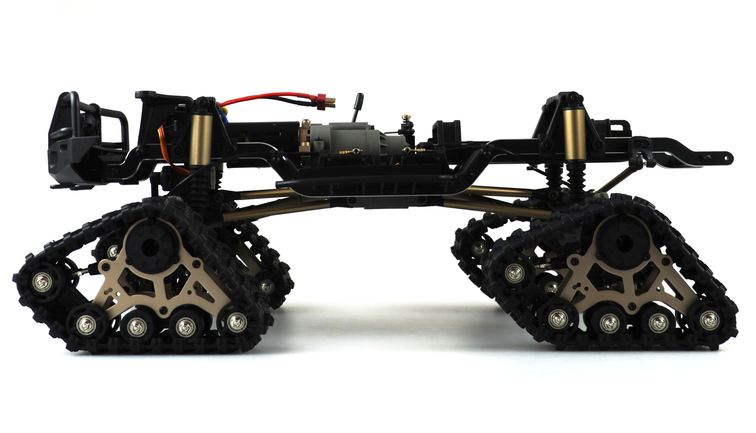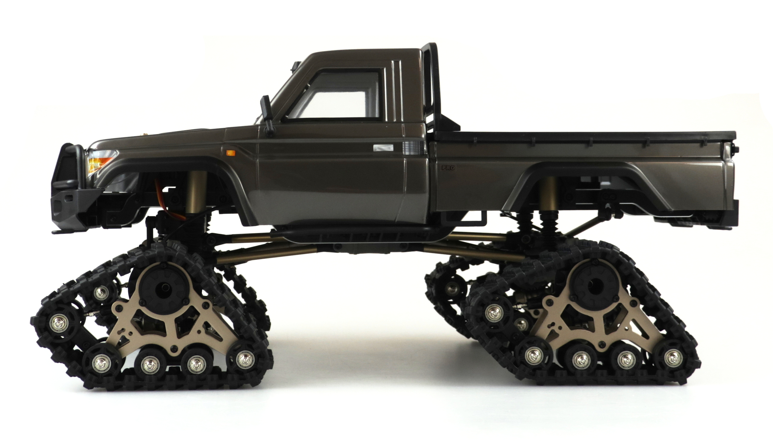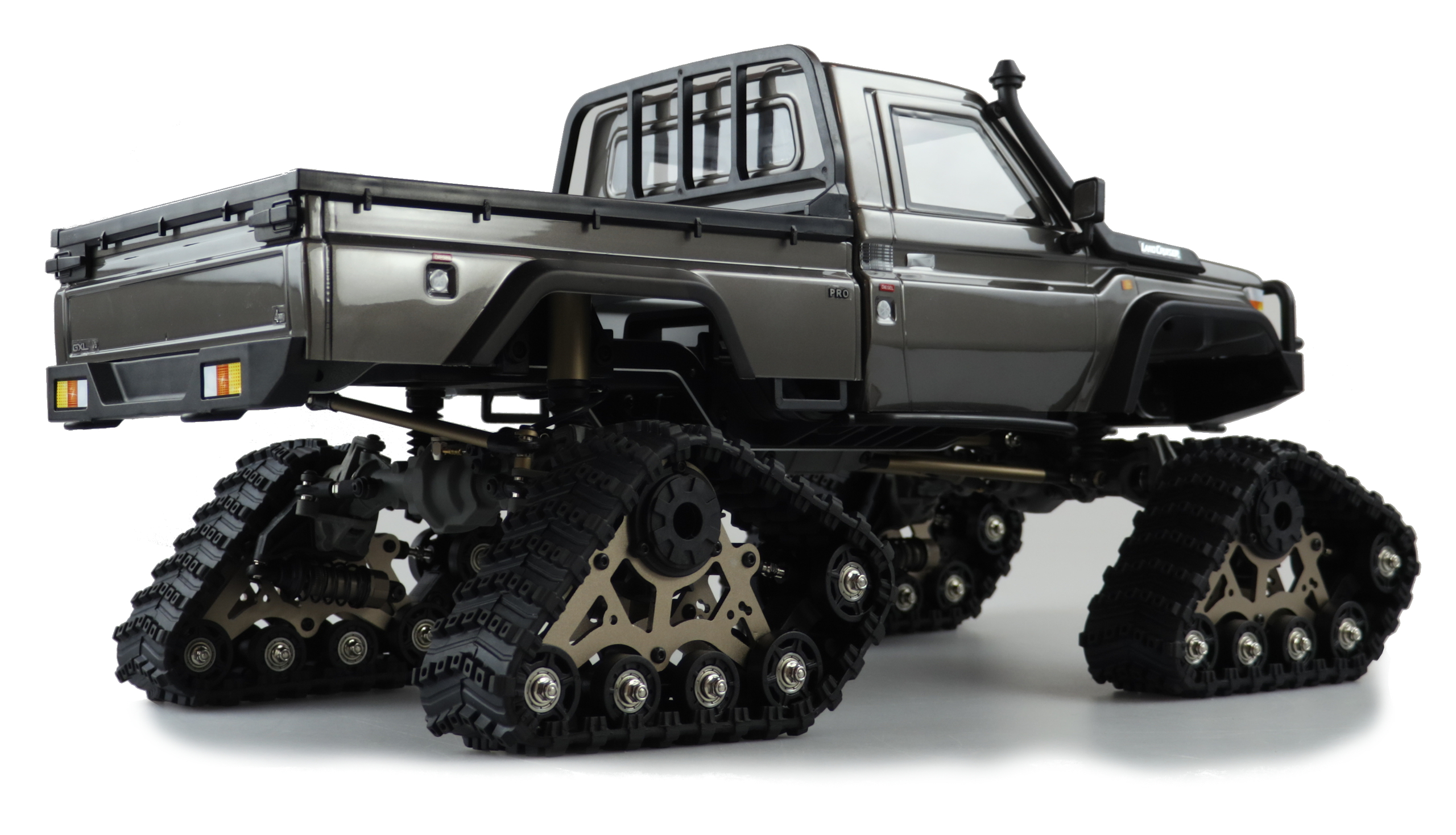 AMXRock RCX10P (Profi RTR) in Grau.Dieser Top Crawler im Maßstab 1:10 vereint super Technik mit genialen Fahreigenschaften. Ausgestattet mit einem massiven 5mm starken Metallrahmen, Portalachsen, Aluminium Streben, Metall Antriebswellen, hochwertigen komplett geschützten Öldruck Stoßdämpfern mit Staubschutz, 550er Bürstenmotor, einem gedämpften Lenkungssystem, getrennt über Sender sperrbare Differentiale (vorne / hinten) und 2 - Gang Schaltgetriebe lässt diese Fahrzeug kaum Wünsche offen. Dieses Fahrzeug ist eine komplette Neuentwickelung und bringt einige neuartige Systeme zum ersten Mal auf den Markt. Das mitgelieferte Kettenfahrwerk sorgt dabei für extreme Geländeeigenschaften auf jedem Untergrund!Features:5mm CNC gefräster 6061 Alu RahmenCVD AntriebswellenVerschraubte 12mm Radmitnehmer Alu Metall Teleskop AntriebswellenEinzeln über Sender speerbare Differentiale V / HEinzigartiges Stoßdämpferdesign mit StaubschutzmanschettenEinzigartiges LenkungssämpfungssystemEinzigartiges 2 - Gang Schaltgetriebe mit SchutzfunktionHochwertige Karosserie mit Magnetverschluss 1,2mm PVC6 Kanal FernsteuersystemHobbywing WP-1060 ESC (Li-Po fähig) Deans550 21T Crawler Motor brushedEinstellbare Aluimium, MotorhalterungCNC gefrästes MotorritzelLenksero 9kg MetallgetriebeSchaltservo 0,9kgSchaltservo Differentiale 2x 0,9kg Komplett KugelgelagertKettenfahrwerk einstellbar, gedämpftTechnische Daten:Länge: 530mmBreite: 220mmHöhe: 265mmRadstand: 313mmBodenfreiheit: min. 50mmRaddurchmesser: 110mmHigh Grip Super Soft ReifenFelgendurchmesser: 62mmGewicht o. Akku: ca. 3,3kgMotor: 21T 550 brushedESC: Hobbywing WP-1060 (Li-Po fähig) DeansFernsteuerung: 2,4GHz 6 KanalKarosserie: 1,2mm PVC lackiertRahmen: 5mm CNC Alu 6061Linkage: MetallCVD AntriebswellenPortalachsenLieferumfang:komplett montiertes Auto4x Kettenfahrwerk einstellbar, gedämpft, Adapter für TRX4 und SCX10 2,4GHz Fernsteuerung 6 KanalAnleitung DE/ENBenötigtes Zubehör:Akku (Ni-Mh 7,2V oder Li-Po 7,4V) z.B. Amewi Art. 28895, 28899, 28900, 289024x Batterie 1,5V AA Mignon für SenderLadegerät