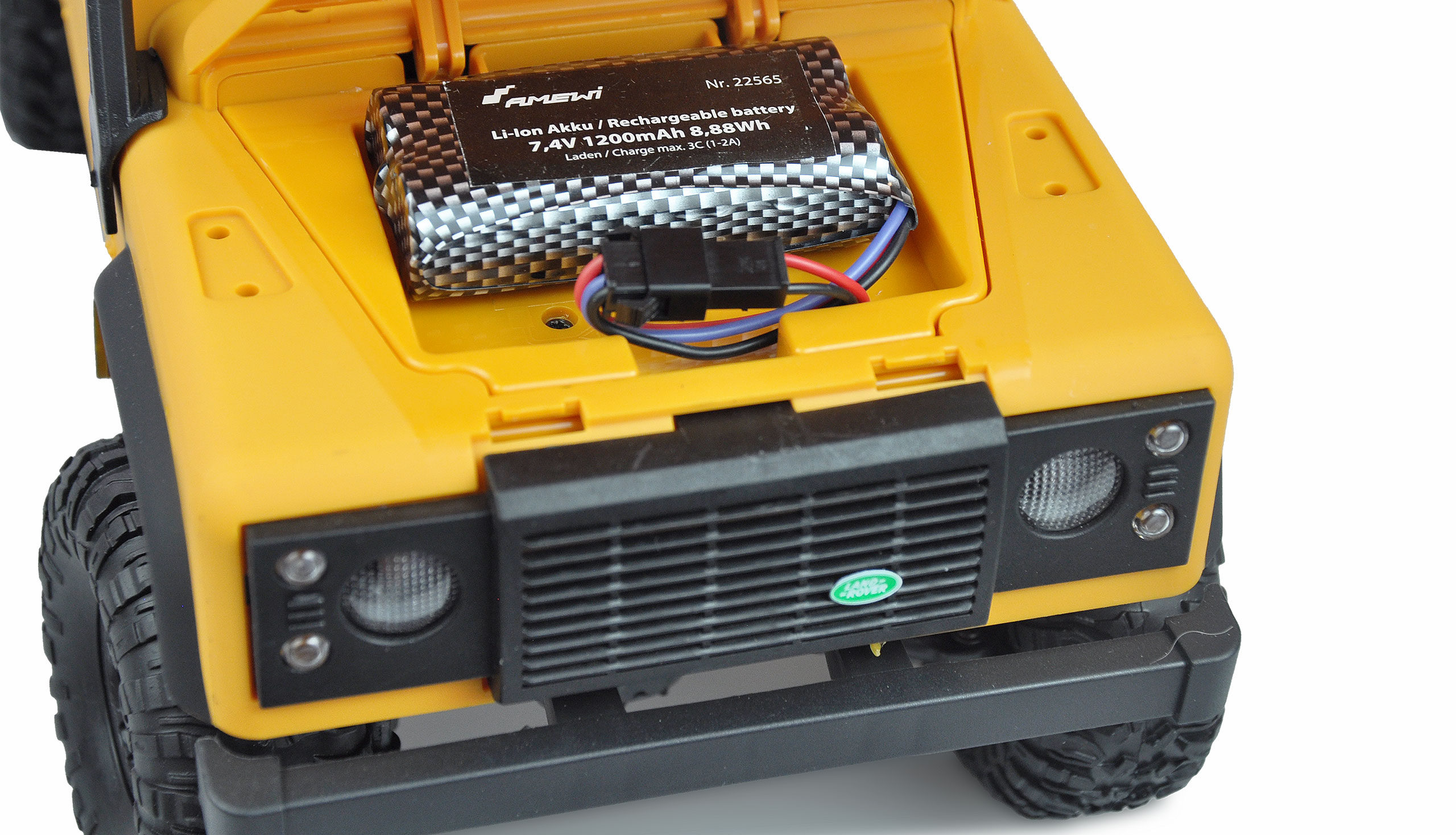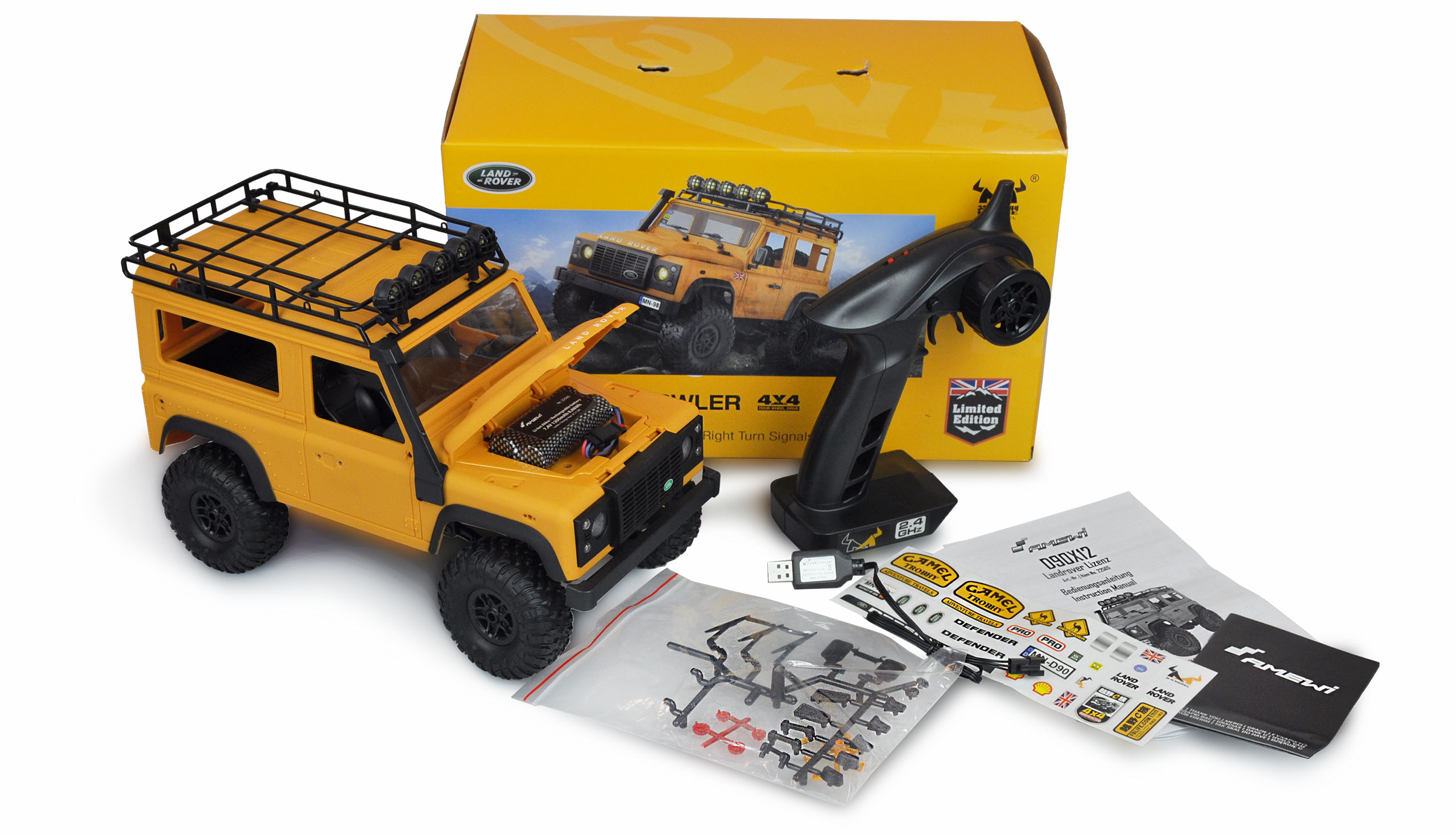 Camel Trophy reloaded - lizenzierter Nachbau des legendären Landrover D-90 Geländefahrzeugs in wunderschöner Scale Optik mit vollwertiger LED-Beleuchtung inkl. Blinker, der im Maßstab 1:12 beim Offroad-Einsatz überzeugt: Das Modell vereint gute Fahreigenschaften mit toller Technik und genialer Optik. Auch kleinste Details sind dem Original nachempfunden. Alle Anbauteile wie Scheibenwischer, Beleuchtungsabdeckungen, Spiegel oder Lufteinlässe werden mitgeliefert. Sämtliche Teile sind gesteckt und müssen nicht geklebt werden. Ein Dachgepäckträger ist bereits fertig montiert, bietet Platz für eigene Ideen wie z.B. eine optionale Werkzeugbox, Ersatzräder o.ä. Jedem Scale-Fan geht hier das Herz auf. Die Motorhaube kann zudem per Hand geöffnet werden: Darunter befindet sich ein Fach für den großen Li-Ion 7,4V 1200mAh Akku. Die hochwertige Lackierung der festen ABS-Karosserie und der Metallrahmen (Chassis) runden das Paket ab.