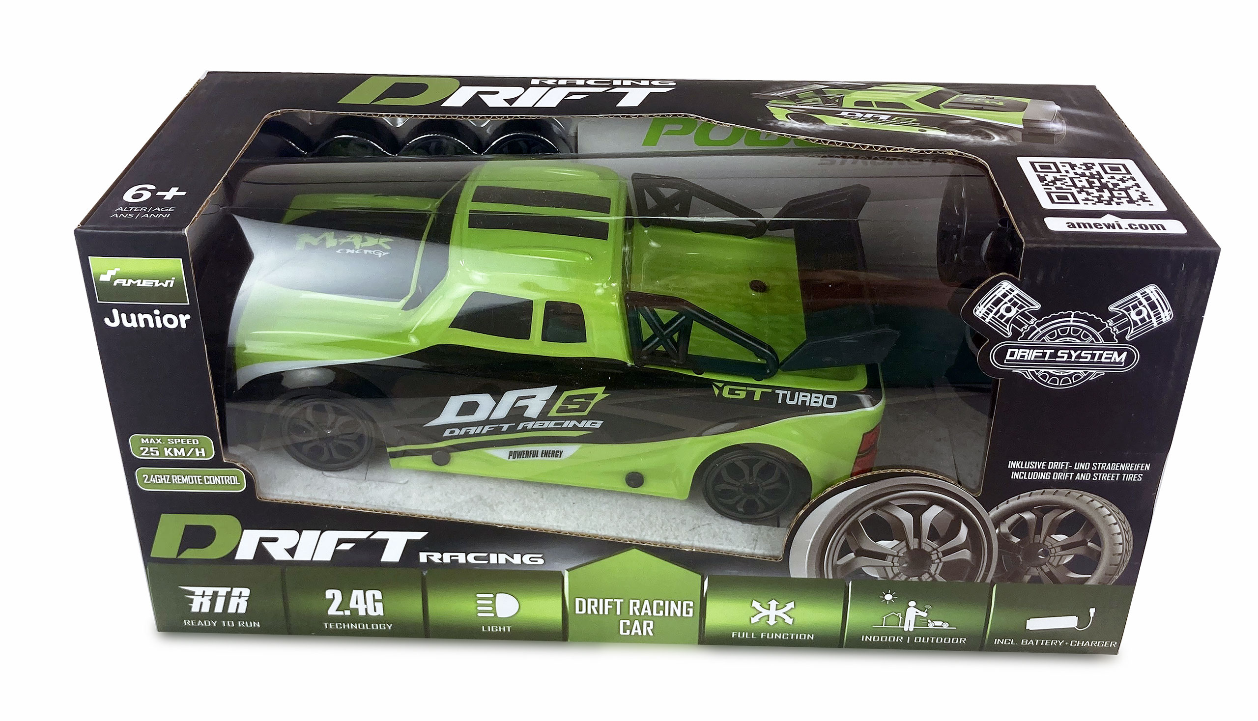 Willkommen in der aufregenden Welt des Driftens ? die Action startet mit dem Racing Car DRs im Maßstab 1:18 sofort aus der Box. Eine präzise 2,4GHz Pistolenfernsteuerung vermittelt ein direktes Fahrgefühl, während das schnelle Lenkservo für präzises Handling sorgt. Der kraftvolle 4WD-Antrieb in Verbindung mit dem großen Akku ermöglicht lange Fahrzeiten und beeindruckende Top-Speeds von bis zu 25 km/h.
