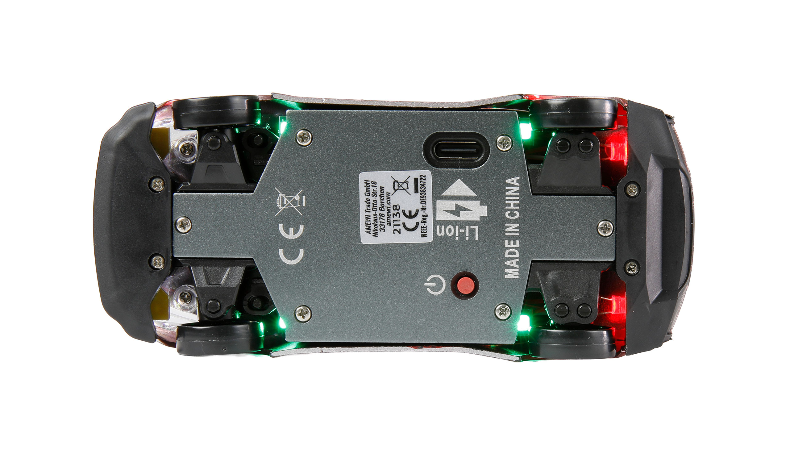 Weitere Features: RTR-Set (Ready-to-Run) inkl. Fernsteuerung, integriertem Akku und Ladekabel Störungssicheres 2,4GHz System Schaltbare LED-Beleuchtung (Unterboden) Feste LED-Beleuchtung vorne/hinten (leuchtet durchgehend immer) Lenktrimmung an der Fernsteuerung Eingebauter LiPo Akku mit 150mAh 3,7V für Fahrzeiten von bis zu 20 Minuten Eingebaute USB-C Ladebuchse zum schnellen Aufladen des Modells (ca. 30 Minuten Ladezeit) Maximale Geschwindigkeit von rund 15km/h Driftreifen (Kunststoff) und Straßenreifen (Gummi) im Lieferumfang Pylonen im Lieferumfang zum Festlegen eines Driftkurses o.ä. USB-A auf USB-C Ladekabel enthalten Unterspannungswarnung am Fahrzeug zum Schutz des Akkus 2g Micro-Lenkservo eingebaut