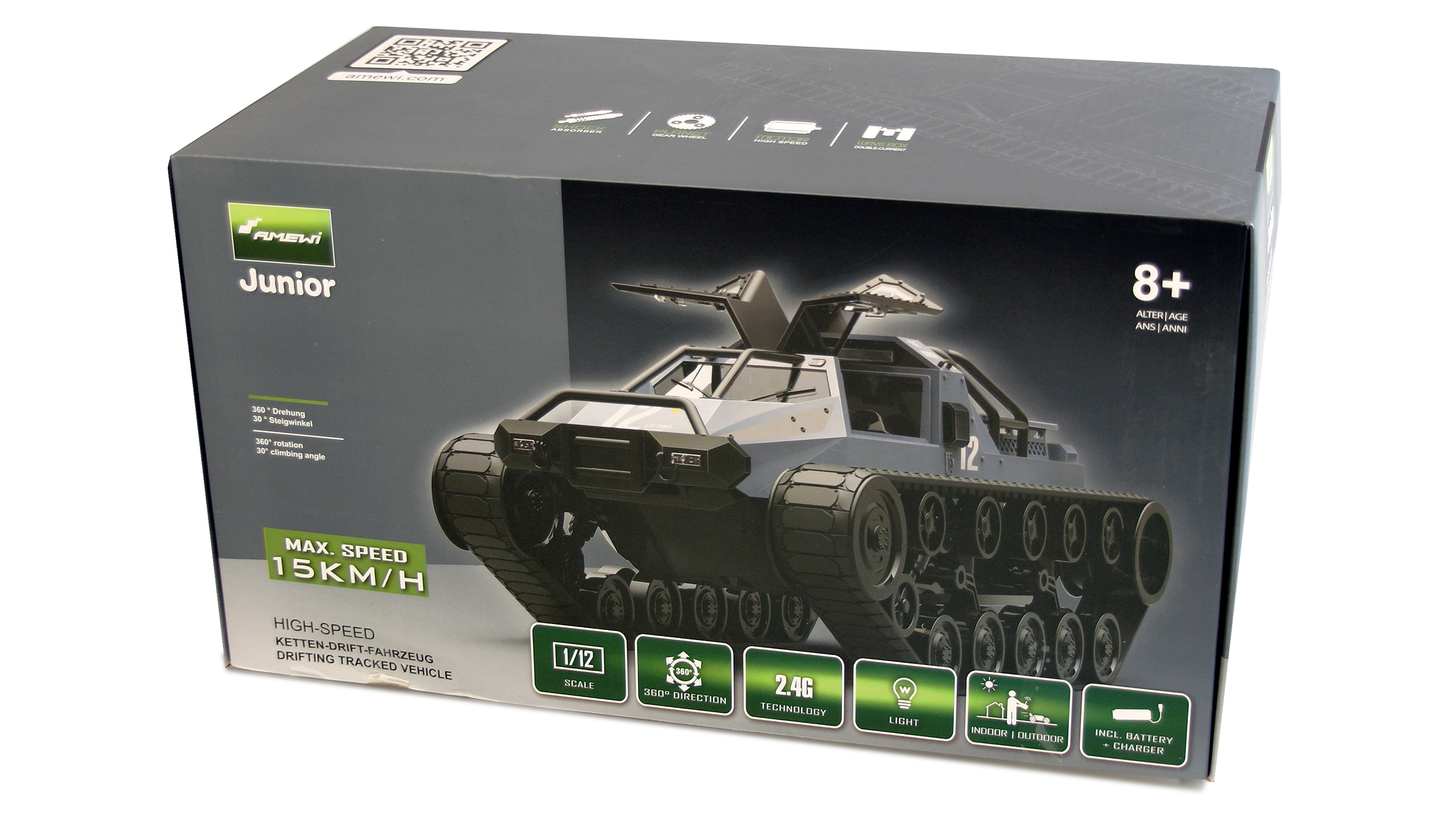 Extrem geländefähiges und futuristisches Kettenfahrzeug mit reichlich Leistung. Das Kettenfahrwerk ist gefedert und die Ketten sind aus Gummi. Somit hat das Modell auf jedem Untergrund genügend Grip. Selbst Wheelis sind problemlos möglich und der Spaß "outdoor" ist fast grenzenlos. Die erreichbare Geschwindigkeit ist ausreichend um wirklich Spaß zu haben und das Gas ist vollproportional steuerbar. Zusätzlich hat das Modell eine LED Lichtleiste auf dem Dach, was auch Fahrten in der Dämmerung zu einem Erlebnis der besonderen Art macht. Aufgrund des Spritzwasserschutzes ist das Modell uneingeschränkt geländefähig und der mitgelieferte 1200mAh Li-Ion Akku sorgt für ausreichende Fahrzeit. Das ebenfalls enthaltene Balancer Ladekabel (USB) rundet das Paket in Verbindung mit dem störungsfreien 2,4GHz Steuersystem ab. Zudem sind die Flügeltüren am Modell bedienbar (öffnen / schließen) was den Scale Charakter des Modells erhöht. Weiter verfügt das Modell über eine Antriebsbox mit Doppel Planetengetriebe, eine Führungsrad-Halterung aus Metall und eine selbsteinstellende Spurweitenregulierung der Vorderräder (dieses verhindert ein Abspringen der Ketten), das Fahrwerk ist komplett gefedert.