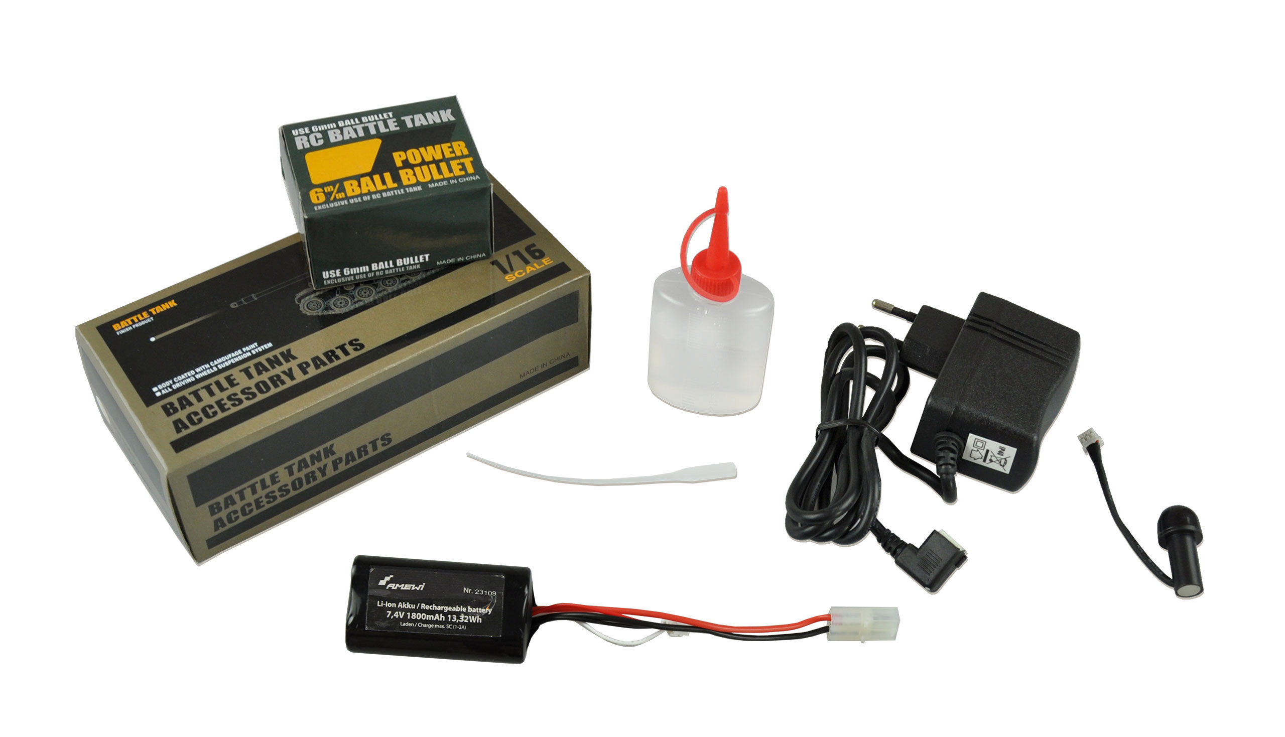 Der Panzer verfügt zudem auch über eine Rauch- und Soundfunktion. Die Schussfunktion erfolgt mittels Steuerknüppel und Drucktaster und verschießt 6mm BB Hartplastikgeschosse bis zu 15m weit. Zusätzlich verfügt das Modell über ein Infrarot Kampfmodul was den Zweikampf mit anderen Panzern aus dieser Amewi Edition zulässt. Bei einem direkten Treffer durch einen gegnerischen Panzer schüttelt sich der getroffene Panzer und simuliert damit einen Treffer. Angetrieben wird das Modell von 2 starken Motoren, die Ihre Kraft über ein mehrstufiges Metallgetriebe an die Antriebsräder übertragen. Das Getriebe ist zu dem innen gekapselt (abgedeckt). Alle Laufräder am Fahrwerk sind mit Metallschwingen mit dem Chassis verbunden und gedämpft. Die Kanone lässt sich hoch und runterfahren und alle Steuerfunktion sind proportional. Dieses Originalgetreue Modell mit seiner Camouflage Lackierung steht dem echten Panzer in nichts nach. Über eine Beleuchtungsanlage verfügt das Modell ebenfalls und der gesamte Lieferumfang entspricht dem neuesten Stand der Technik. Die Elektronik ist auf dem Stand 7.0 und ab sofort liefern wir alle Modelle mit einem Zeitgemäßen LiPo Akku mit 1800mAh und 7,4V aus. Ein passendes LiPo Ladegerät liegt dem Set ebenfalls bereits bei.