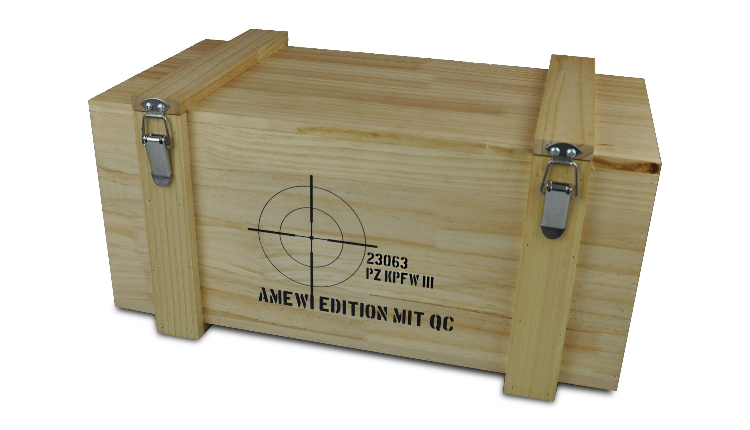 Die AMEWI Edition ist ein originalgetreuer Nachbau im Maßstab 1:16 und er wird als RTR ? Ready-To-Run Version ausgeliefert. Im Lieferumfang ist alles für den Betrieb erforderliche Zubehör enthalten (außer Batterien für den Sender 6 x AA 1,5V Mignon). Der Panzer verfügt über eine Schuss, Rauch und Soundfunktion was den Scale Grad nochmal deutlich erhöht. In der aktuellen Version wurde zudem ein IR Kampfmodul nachgerüstet, um spannende Kämpfe mit anderen Modellen aus unserer Standard, Advanced oder Pro Linie Serie auszutragen. Ein Treffer wird dann durch ein ?Schütteln des Modells simuliert. Als IR Schussfunktion dient dann das Bord MG. Die Hauptkanone verschießt zudem noch 6mm BB Kugeln bis zu 15m weit. Das hochwertige neu übersetzte und gekapselte Kunststoffgetriebe verteilt die Kraft des Antriebes (je ein Motor pro Seite) perfekt an die Ketten des Modells und das gesamte Fahrwerk ist gefedert und mit Schwingen versehen was das Fahrverhalten im Gelände optimiert. Die Lieferung des gesamten Modells erfolgt in einer hochwertigen Echtholzbox.
