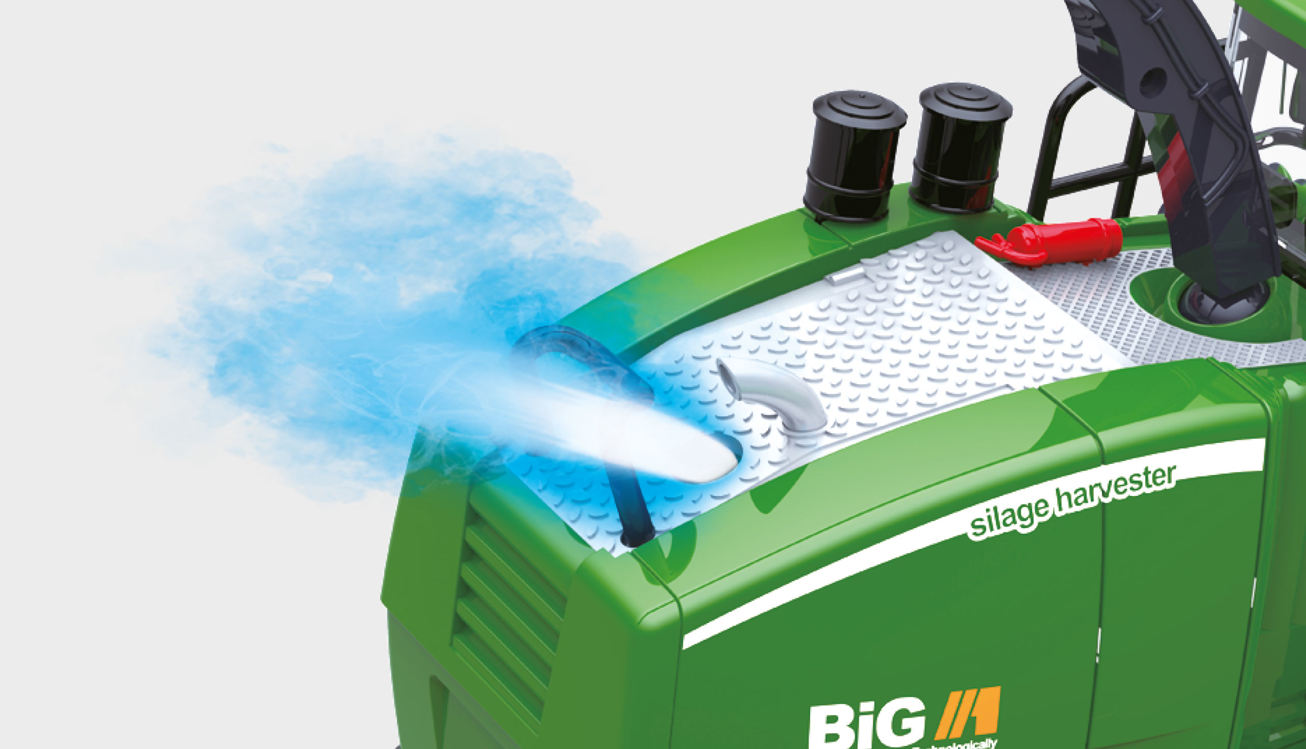 Die ganze Maschine sitzt auf einem Fahrwerk, das von zwei großen Rädern direkt hinter dem Vorwerk und unterhalb der Kabine dominiert wird. Die Lenkung funktioniert über die kleineren Hinterräder. Die Bereifung mit markanten Profilrillen ist aus weichem Gummi, die über eine zusätzliche Traktionskontrolle stets für besten Halt auf dem Untergrund sorgen. Wie bei modernen Landmaschinen üblich, symbolisiert die geschlossene Fahrerkabine wirksamen Schutz vor Staub, Lärm und Hitze. Im Innern sind Details wie Sitze, Lenkrad, Joystick und Bordcomputer zu erkennen. Außen befindet sich jeweils eine Reling mit angedeuteten Seitenspiegeln.