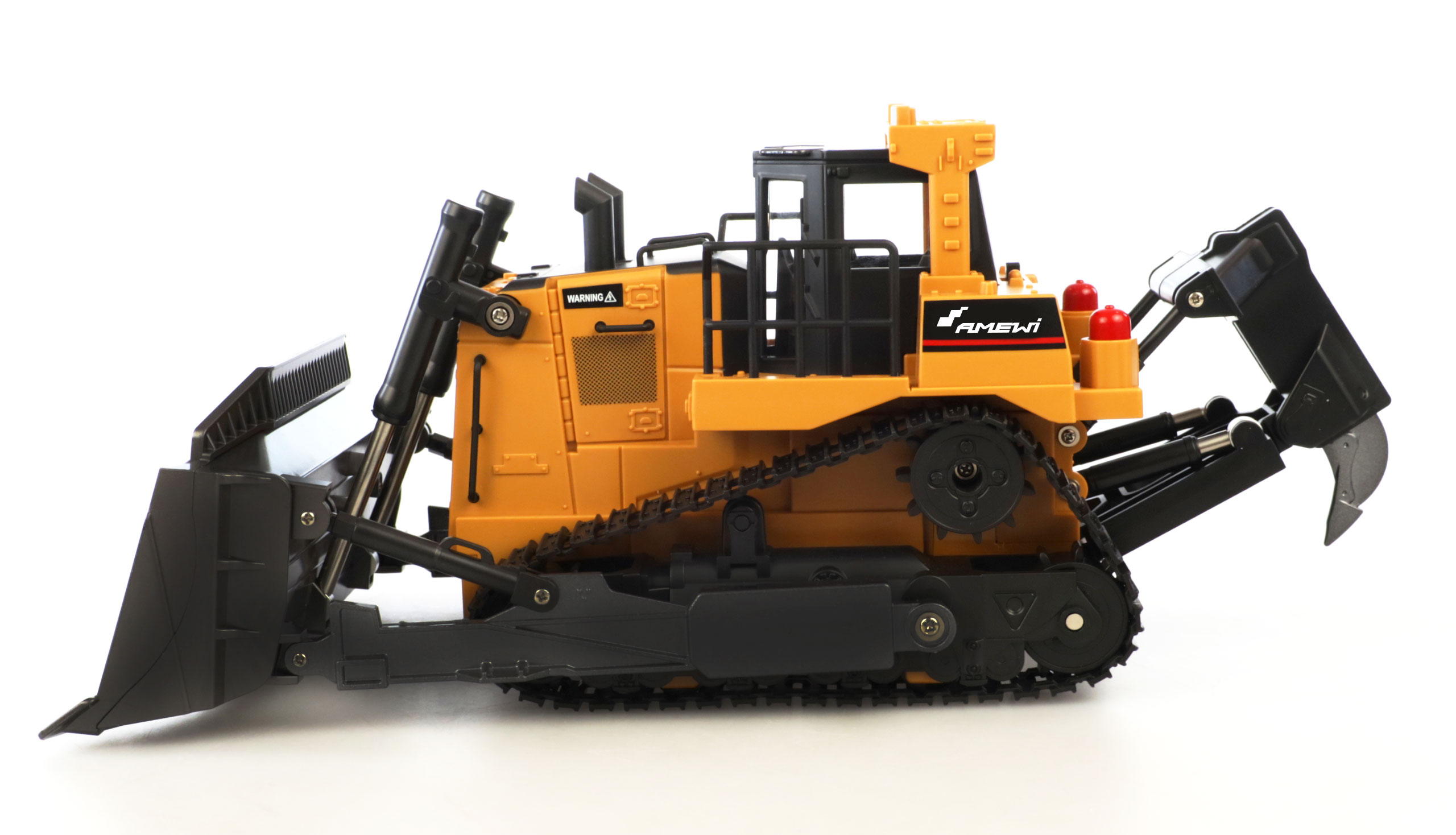 Kleine Scale-Planierraupe im Maßstab 1:24 mit vielen spannenden Funktionen wie z.B. Schild heben/senken, vor/zurück und auf der Stelle drehen, die das tatkräftige Arbeiten im Kleinen vielfältig und zum großen Vergnügen nachstellen lässt. Dank schaltbarem Soundmodul ist gleichzeitig für eine authentische Akustik gesorgt. Zusätzlich ist dieser tolle RC-Bulldozer mit einem absenkbaren Aufreißhaken am Heck ausgestattet, um z.B. Erdreich aufzulockern. Mit dem extra breiten Arbeitsschild und dem kräftigen Antrieb inkl. Gummiketten lässt sich das Modell auch im schwierigen Gelände problemlos bewegen. Wer z.B. auch Sand oder Kies schieben möchte, findet hieran seine wahre Freude. Das linke und rechte Kettenwerk lassen sich für schnelle Drehungen unabhängig voneinander steuern. Der integrierte Spritzwasserschutz in Verbindung mit dem hochwertigen 2,4GHz Sender und der 500mAh 7,4V Li-Ion Akku garantieren auf der heimischen Baustelle ausdauernden Fahrspaß. Mit dem ebenso bereits im Lieferumfang enthaltenen USB-Ladekabel ist das Modell zudem zügig wieder einsatzbereit, wenn auch der Fahrzeugführer mal eine Verschnaufpause einlegt. Diese Planierraupe ist insgesamt eine tolle Ergänzung zu unserer bereits bestehenden Baustellen-Fahrzeugflotte und ist dank seines robusten sowie einfachen Aufbaus für Kinder ab 8 Jahren bestens geeignet. Dem freudigen Nachspielen der Baustellenarbeit, das gleichzeitig Neugier auf Technik weckt, steht nichts mehr im Weg.