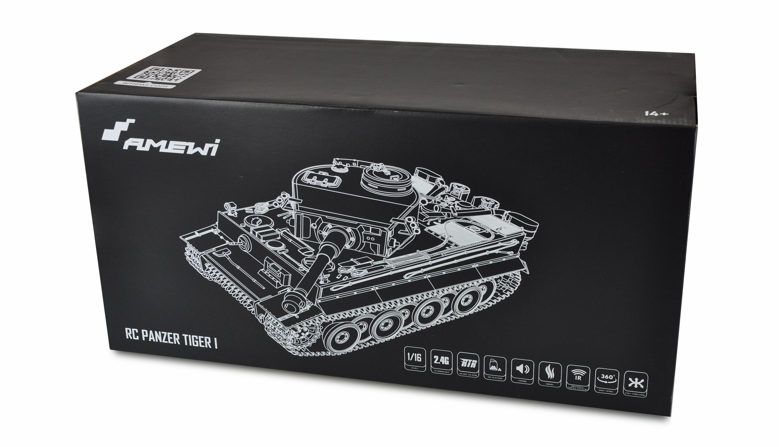 Die AMEWI Edition ist ein originalgetreuer Nachbau im Maßstab 1:16. Es handelt sich hierbei um eine RTR (Ready-to-Run) Version in der neuesten Ausführung (Elektronik TK 7.0) und ist mit einem gekapselten Metallgetriebe und mit Metallschwingen für die Laufräder ausgestattet. Der Panzer verfügt zudem über eine Rauch- und Soundfunktion. Die Lieferung erfolgt in einem hochwertig bedruckten Karton mit passendem Styroporkern. Jeder Panzer wird vor der Auslieferung auf Funktionalität und Vollständigkeit getestet. Eine Checkliste liegt bei. Ebenfalls im Lieferumfang enthalten ist ein Infrarot-Kampfmodul, welches spannende Zweikämpfe mit anderen Modellen der AMEWI Standard, Advanced oder Pro Linie zulässt. Bei einem direkten Treffer mit dem Infrarot-MG "schüttelt" sich der getroffene Panzer und zeigt somit einen Treffer an. Der Panzer lässt sich feinfühlig steuern und das Modell besticht durch originalgetreue Geräusche und durch viele Funktionen. Der Tiger verfügt neben dem Infrarot-Kampfmodul noch über eine 6mm BB Schussanlage über das Hauptgeschütz (Kanone). Alle Funktionen sind vollproportional steuerbar. Fünf verschiedene Sounds sind über den Sender einstellbar.