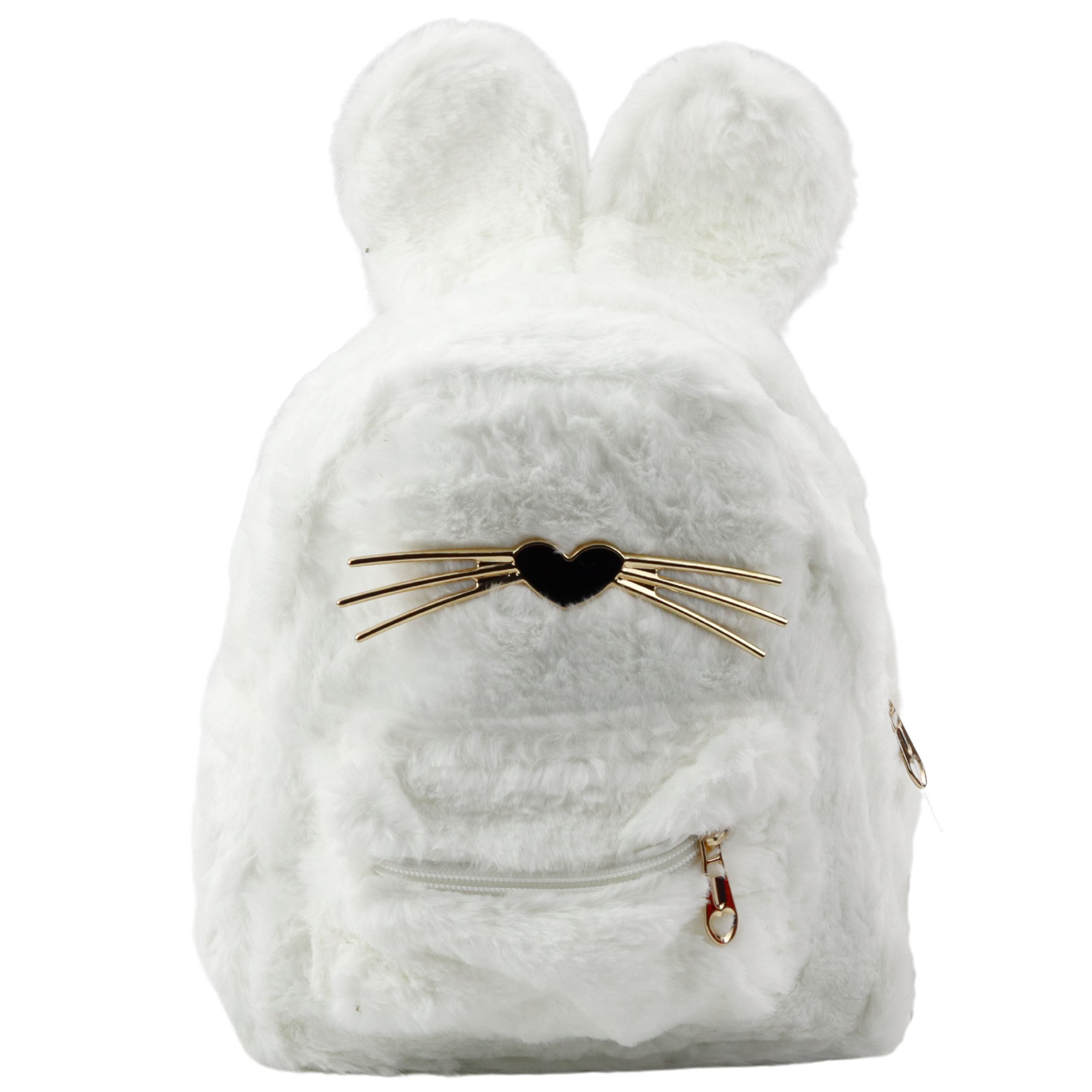 KINDERRUCKSACK WEISS, PELZIG, MIT HASENOHREN UND GOLDENEN SCHNURRAHMEN, 3 L Dieser weiße Kinderrucksack mit Hasenmotiv ist ein einzigartiges Angebot für die Kleinsten, die weiche, kuschelige und lustige Accessoires lieben. Der Rucksack besteht aus weichem, pelzigem Synthetikmaterial, das sich angenehm anfühlt und kindersicher ist. Charakteristisch sind die hervorstehenden Hasenohren, die goldene herzförmige Nase und die dekorativen Schnurrhaare, die dem Ganzen einen märchenhaften Charakter verleihen. Das Modell verfügt über ein Hauptfach mit Reißverschluss und eine praktische Vordertasche für schnellen Zugriff auf kleine Accessoires. Dank verstellbarer Riemen aus weichem Material lässt sich der Rucksack leicht an die Größe des Kindes anpassen und sorgt so für hohen Tragekomfort. Mit seinen Abmessungen und einem Fassungsvermögen von ca. 3 Litern ist der Rucksack kompakt und bietet gleichzeitig Platz für alles Wichtige – Lieblingsspielzeug, Snacks, Wasserflasche oder ein Buch. Perfekt für den Kindergarten, Kurztrips, Familienbesuche oder zum Spielen im Garten. SPEZIFIKATIONEN: Maße: 22 x 20 x 8 cm Fassungsvermögen: ca. 3 Liter Material: weicher Kunstfellstoff, Metall Farbe: Weiß Fächer: 1 Hauptfach, 1 Vordertasche Verschluss: Reißverschlüsse Gurte: verstellbar, Stoff SETINHALT: Weißer Kinderrucksack mit Hasenohren und dekorativen Schnurrhaaren
