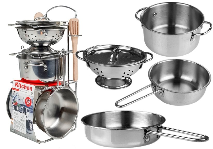 Ein Set aus Küchenzubehör mit mehreren Elementen Das Spielen mit dem Haus ist eine der beliebtesten Unterhaltungsmöglichkeiten für Kinder. Sie können verschiedene, originelle Szenarien erstellen - Kinder können die Rollen spielen, für die sie verschiedene Zubehörteile benötigen, um das Spielen zu erleichtern. Die Kinderkollektionen umfassen unter anderem Küchen, Geschirr, Besteck und Lebensmittel. Das Set, das wir präsentieren, besteht aus glänzendem Silbergeschirr aus Metall, zu dem unter anderem ein Topf, Pfannen oder ein Sieb gehören. Die Vielzahl der Elemente sorgt für Spaß, bei dem die Kleinen so tun können, als würden sie köstliche Gerichte zubereiten, und sie auch ihren Eltern sowie Teddybären und Puppen servieren. Das Set enthält: - Sieb - Topf - Grillpfanne, - Pfanne, - Holzlöffel und Gabel - Geschirrkorb Alle Produkte sind so dimensioniert, dass sie den Abmessungen kleiner Kinderhände entsprechen. Diese Elemente sind sehr leicht, so dass das Spielen für die Kleinen kein Problem darstellt. Die Farben aller Elemente des Sets beziehen sich auf ihre echten Gegenstücke, was sicherlich die Aufmerksamkeit jedes kleinen Küchenchefs auf sich ziehen wird. Die sichere Konstruktion von Geschirr und Lebensmitteln ist eine Garantie für die Sicherheit des Spiels. Alle Elemente bestehen aus sicheren Materialien. Das Gerät entspricht der Norm EN 71. Es ist für Kinder über 3 Jahre gedacht. Ein Satz Küchenzubehör wird auf einen dafür vorgesehenen Ständer gestellt. Abmessungen ausgewählter Elemente des Sets: - Sieb: 5,5 cm x 16 cm - Topf: 5,5 cm x 16 cm - Pfanne: 5,5 cm x 20 cm - Standhöhe: 33cm Verpackungsmaße: 16 x 16 x 33 cm