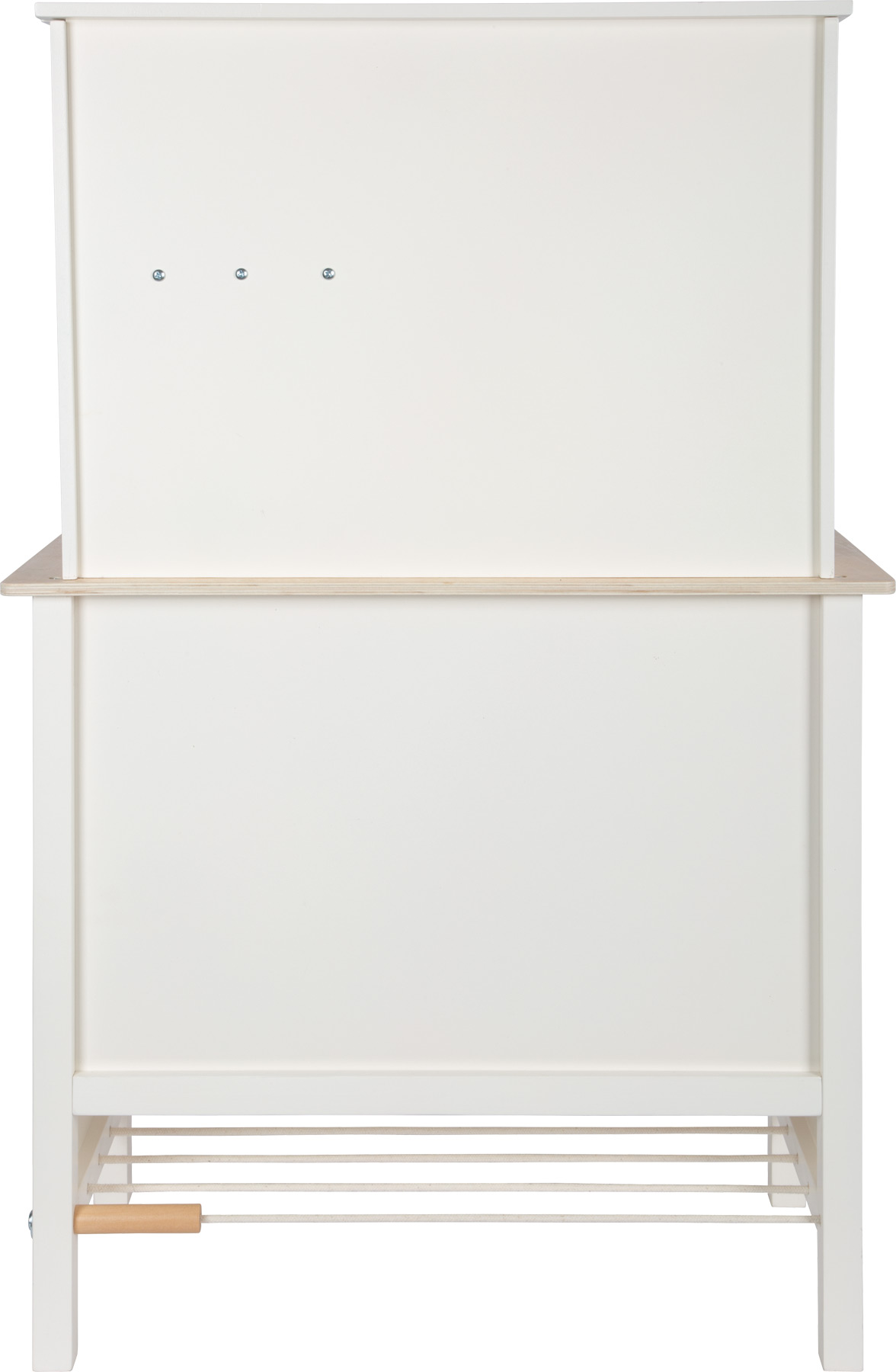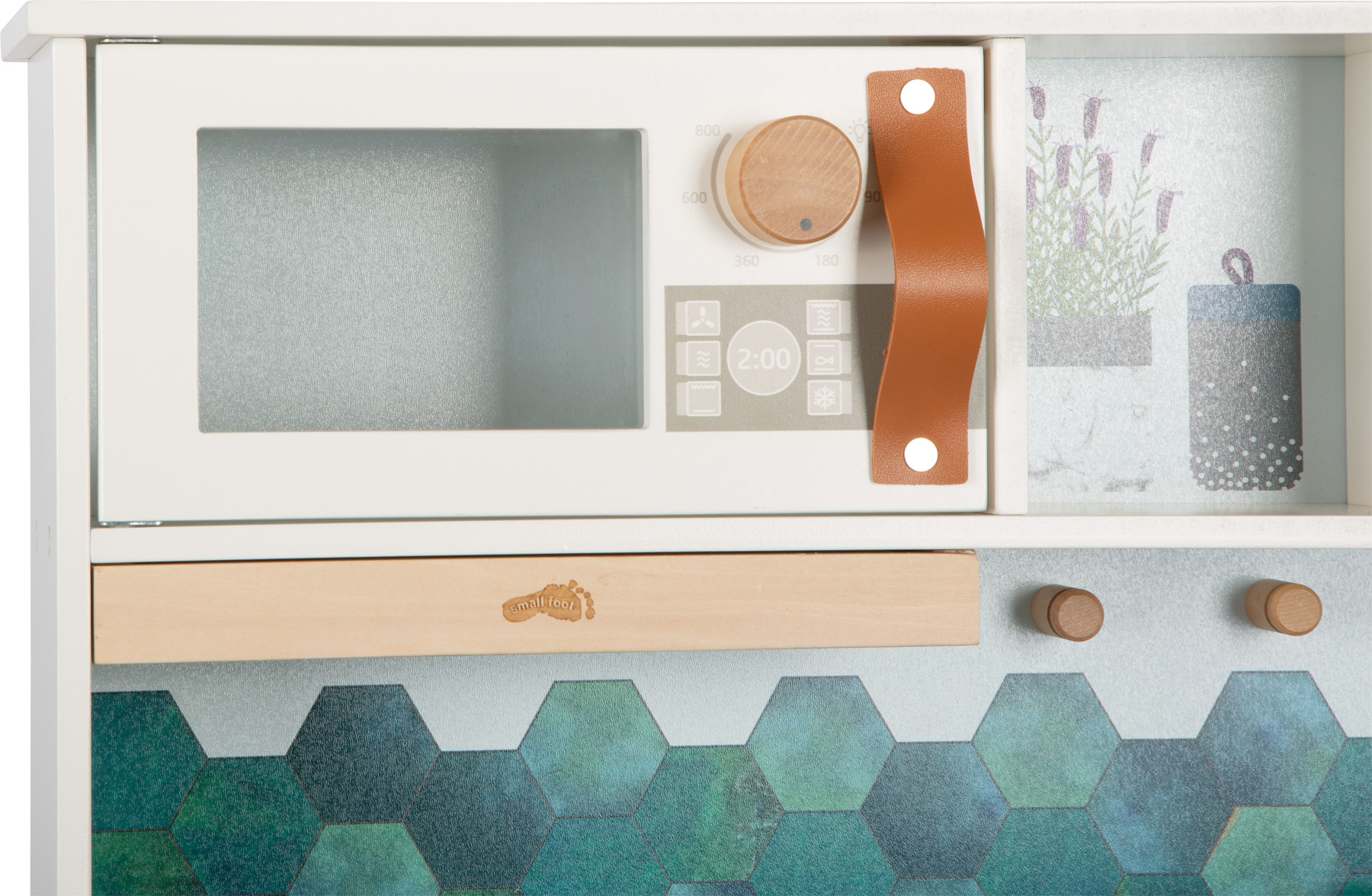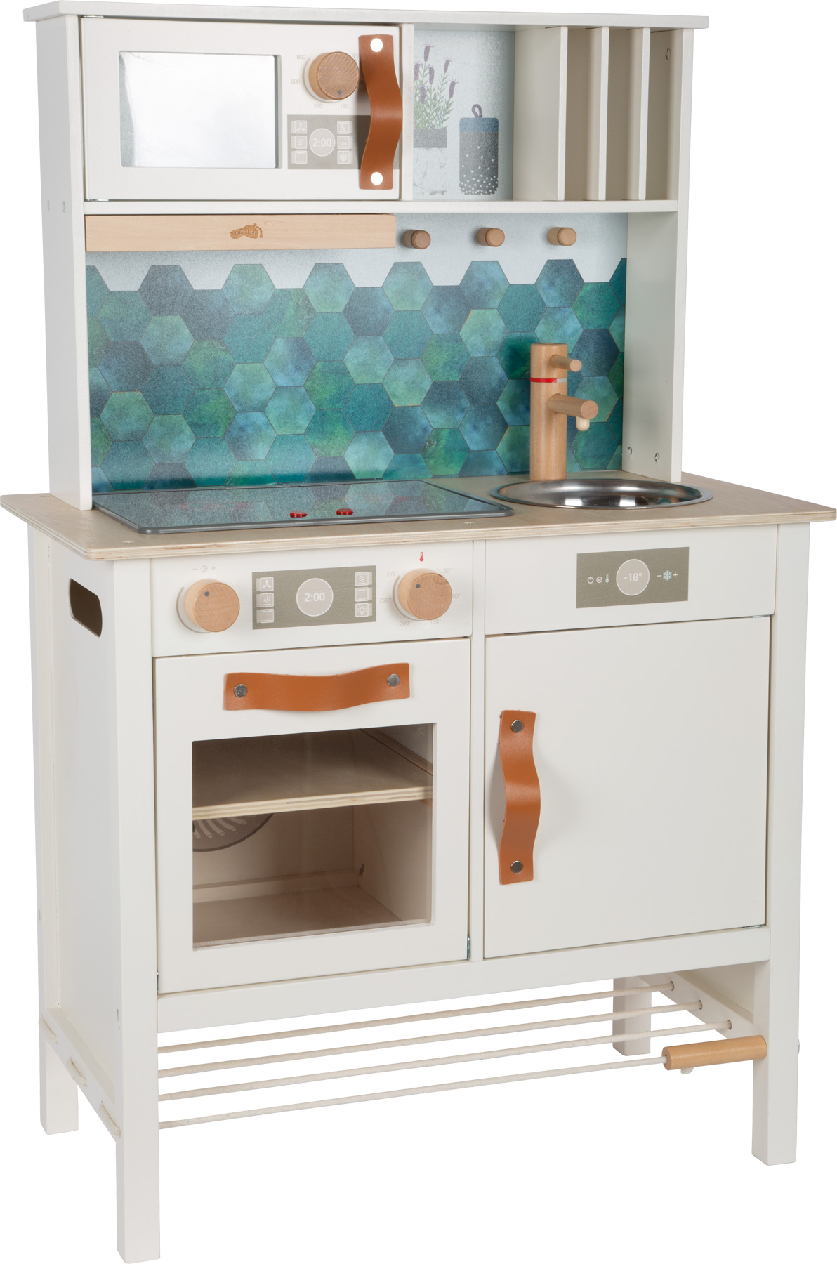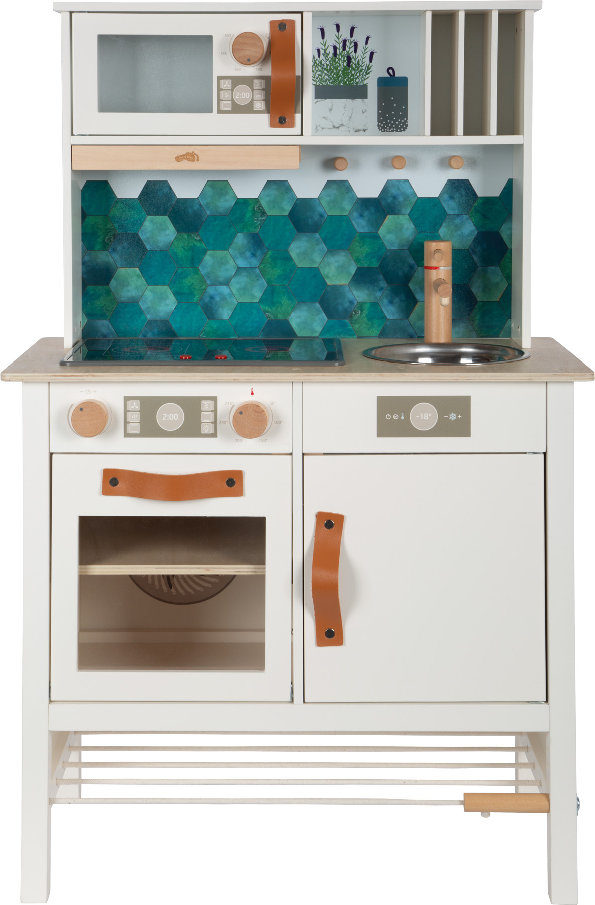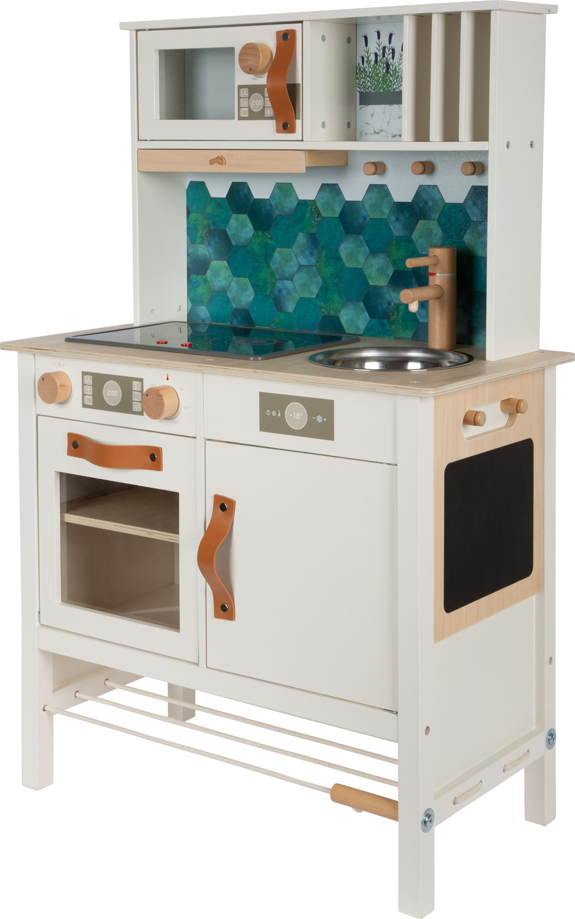 Ein echter Hingucker im Kinderzimmer! Stabil und modern konstruiert, überzeugt diese Spielküche durch die elegante Farbgestaltung in warmweiß, kombiniert mit stylischen, cognacfarbenen Kunstledergriffen. Die Optik wird durch Details wie einer wendbaren Rückwand (Fliesenoptik/schlicht) und bedruckten Flächen in Kühlschrank und Backofen ergänzt. Mit einer Arbeitsplatte, drehbaren "Klick"-Knöpfen, einem elektrischen Kochfeld mit Licht und Sound, einem Metall-Waschbecken sowie einem Backofen mit herausnehmbarem Backblech/Tafel bietet sie realistischen Spielspaß. Ein Highlight ist die herausziehbare Dunstabzugshaube! Dank des mitgelieferten Zubehörs (Topf, Pfanne und drei Küchenhelfer) ist die Küche sofort einsatzbereit! Es werden 2x AA-Batterien benötigt (nicht enthalten). Diese Traumküche aus Holz lässt keine Wünsche offen! Kleine Nachwuchsköch:innen können mit dieser Spielküche ihre kulinarischen Fantasien ausleben, während designbewusste Eltern den modernen und stilvollen Look schätzen – perfekt für das Kinderzimmer oder als charmantes Designobjekt im Wohnzimmer! Kreide für die Tafelfläche ist nicht enthalten..ACHTUNG! Nicht für Kinder unter 3 Jahren geeignet.|ACHTUNG! Kleine Teile. Erstickungsgefahr. Lange Schnur / lange Kette. Strangulationsgefahr. Hinweise aufbewahren..Inhalt: