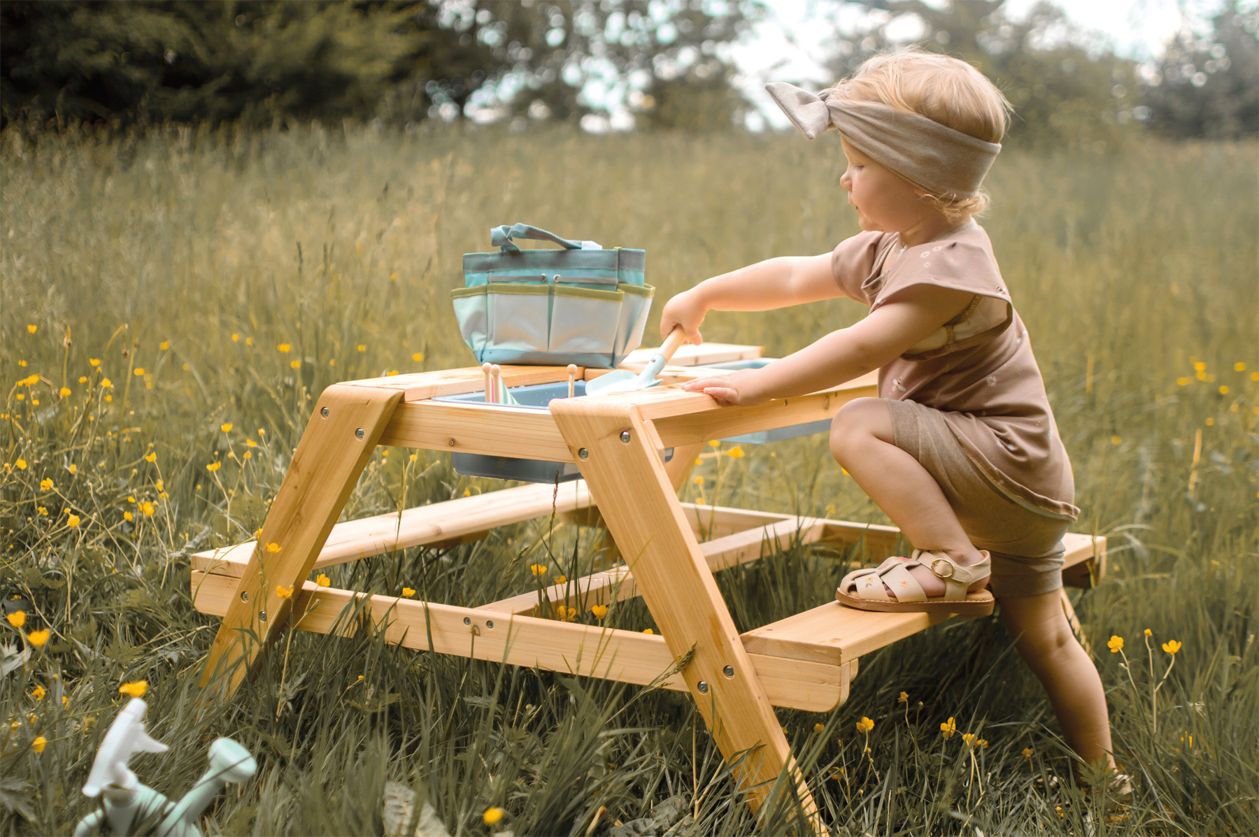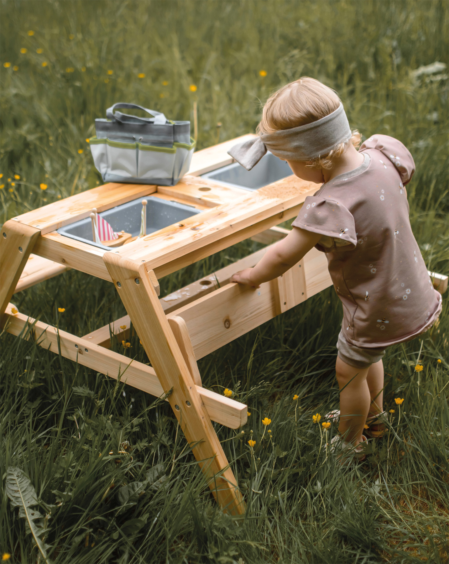 Spielen & Matschen für kleine Entdecker! Dieser Picknicktisch aus unbehandeltem, wetterbeständigem Vollholz ist nicht nur ein Blickfang im heimischen Garten, auf der Terrasse oder dem Balkon, er bietet Kindern vor allem die Möglichkeit für stundenlanges kreatives Spielen an der frischen Luft. Das Highlight versteckt sich im Inneren des Kindertisches – sobald die zwei Tischplatten hochgenommen werden, entsteht ein herrlicher Ort zum Spielen mit Sand, Wasser und Matsch! Die zwei herausnehmbaren Matschschüsseln aus robustem Kunststoff sind mit ihrem Fassungsvermögen von je ca. 3 Litern nicht nur zum Matschen hervorragend geeignet, sie dienen auch zum Aufbewahren von Sandspielzeug, zur Bevorratung von Sand, zum Sammeln von Naturmaterialien oder zum Befüllen mit Wasser. Die Sitzbankflächen können hochgeklappt werden, so dass sie vor Witterung geschützt sind und Kinder auch im Stehen am Tisch spielen können. Eine pfiffige, multifunktionale Kindersitzgarnitur, die neben ihrer Funktion als Matschtisch auch als Picknicktisch oder zum Malen und Basteln genutzt werden kann. Die Aussparungen im Bereich der Kunststoffwannen erleichtern das Herausnehmen der Wannen und in dem Loch in der Mitte der Tischfläche kann ein eigener geeigneter Sonnenschirm Platz finden, um Schatten zu spenden. Ausgestellte Beine sorgen für einen sicheren Stand, das hochwertige Holz garantiert eine lange Lebensdauer. Das ist wichtig, denn ein Matschtisch animiert Kinder über einen langen Zeitraum immer wieder zu neuen, kreativen Spielideen und zum Experimentieren: Was schwimmt auf der Wasseroberfläche, was geht unter? Was passiert mit Sand, wenn er nass wird? Welche Formen lassen sich mit Sandspielzeug erschaffen? Das Spielen mit Sand bietet vielfältige Sinnesreize über die Oberflächenwahrnehmung der Haut und fördert feinmotorische Kompetenzen. Für eine langlebige Nutzung und zum Schutz des unbehandelten Holzes, kann es mit einer Holzschutzlasur behandelt und farblich an die eigenen Bedürfnisse angepasst werden...Inhalt: